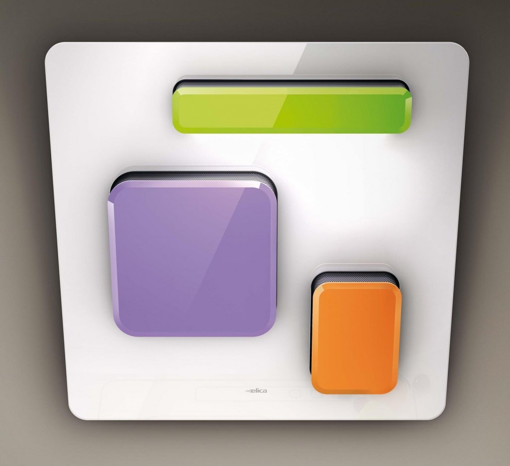 Da superfície quadrangular emergem três painéis em resposta às funções de aspiração e iluminação, criando uma composição equilibrada e divertida.