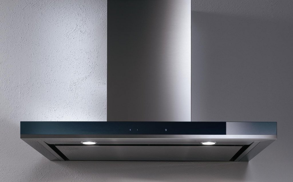 Com design retilíneo em aço e painel em vidro preto espelhado, desenvolvido pelo estúdio italiano de design ELICA, para sofisticados projetos de cozinhas.