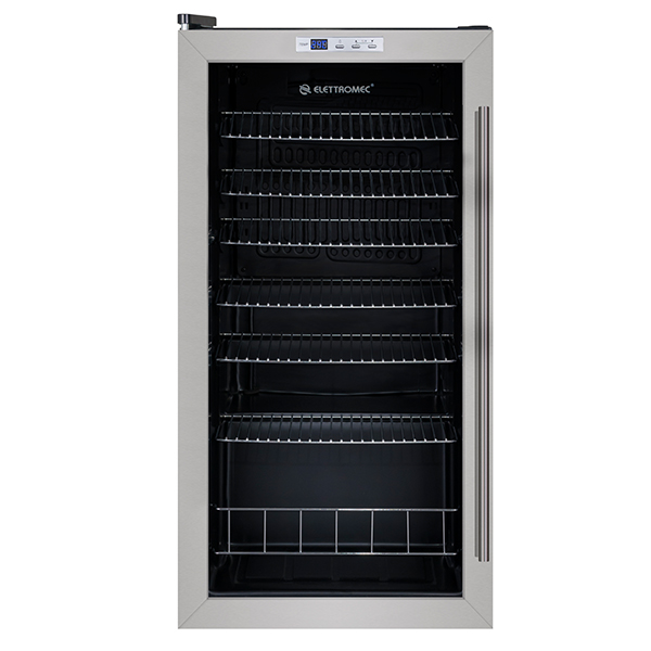 O Frigobar de 88 litros possui um sofisticado acabamento preto no interior, prateleiras cromadas, porta de vidro com bordas em inox e capacidade de armazenar até 88 litros. Além de oferecer comodidade para o usuário, se adapta a qualquer ambiente, servindo como objeto de decoração.