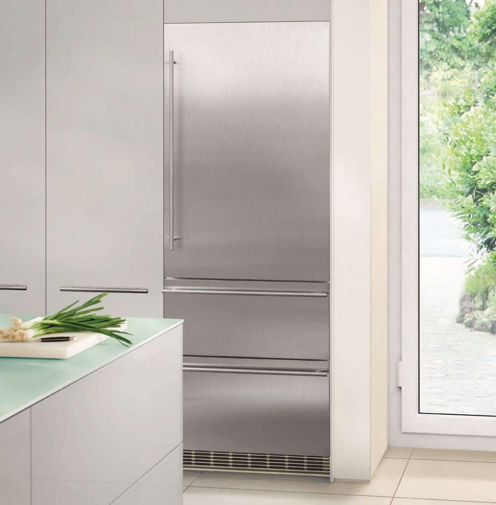 Sua porta e gavetas para revestir estão equipadas com puxadores e painéis em aço inox alemão Liebherr, criando uma perfeita integração do refrigerador com os móveis de sua cozinha planejada, sem frestas de ventilação.