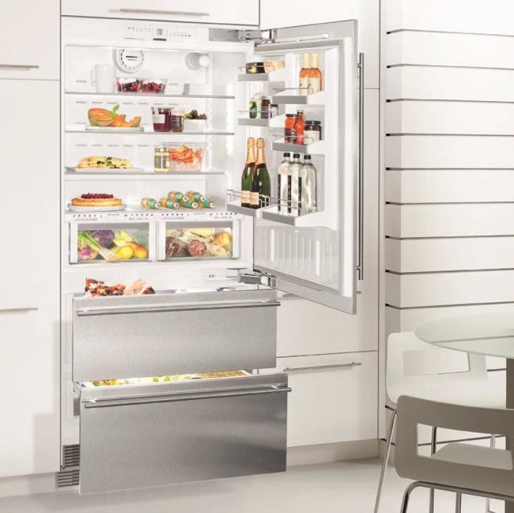 Sua porta e gavetas para revestir estão equipadas com puxadores e painéis em aço inox alemão Liebherr, criando uma perfeita integração do refrigerador com os móveis de sua cozinha planejada, sem frestas de ventilação.
