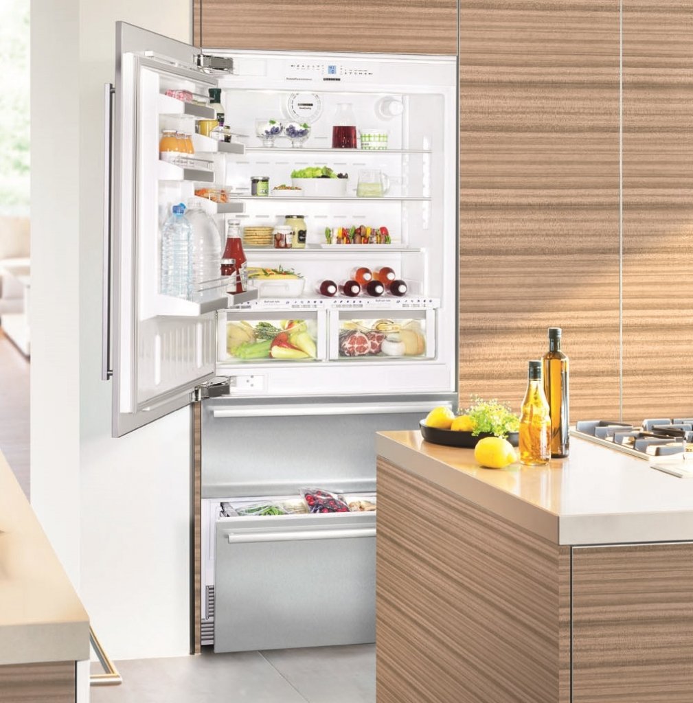 Sua porta e gavetas para revestir estão equipadas com puxadores e painéis em aço inox alemão Liebherr, criando uma perfeita integração do refrigerador com os móveis de sua cozinha planejada, sem frestas de ventilação.